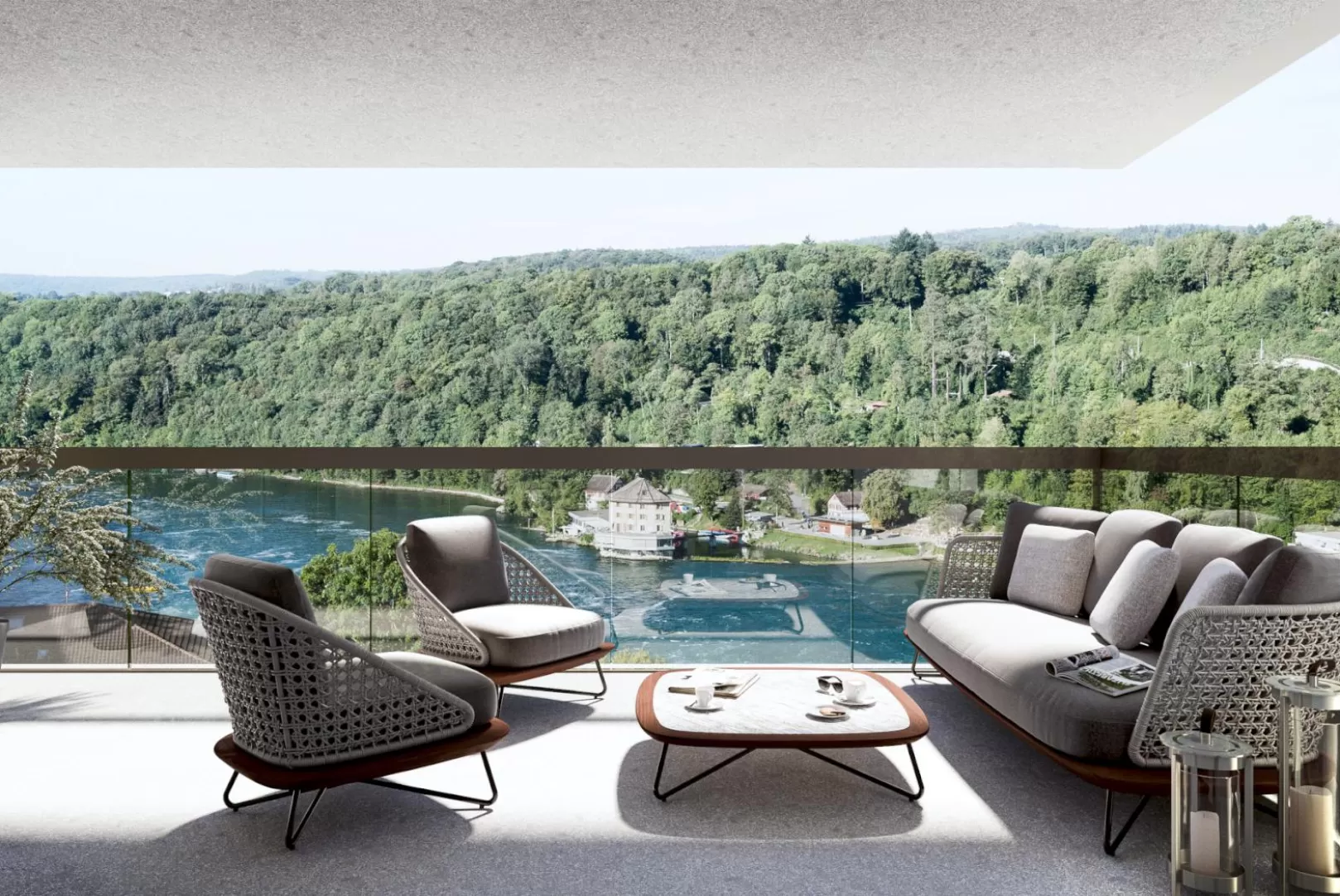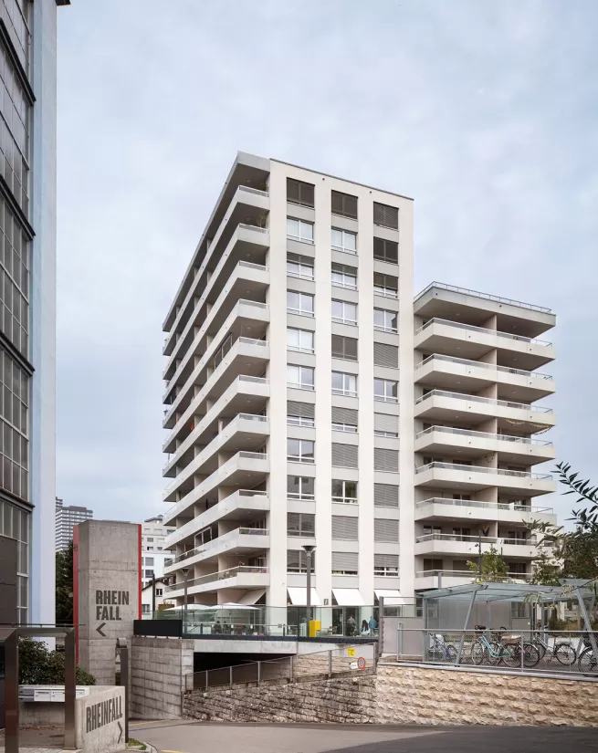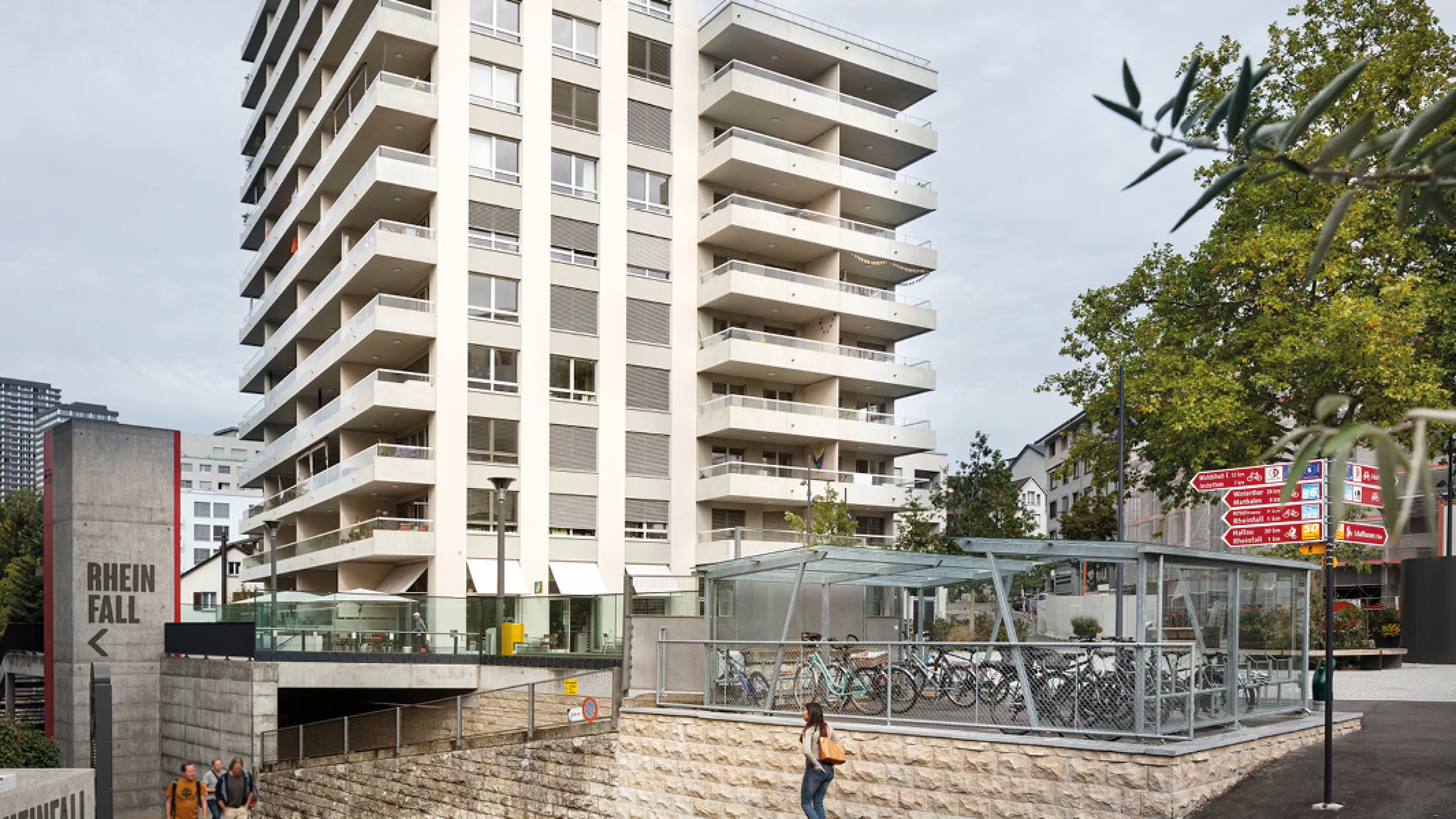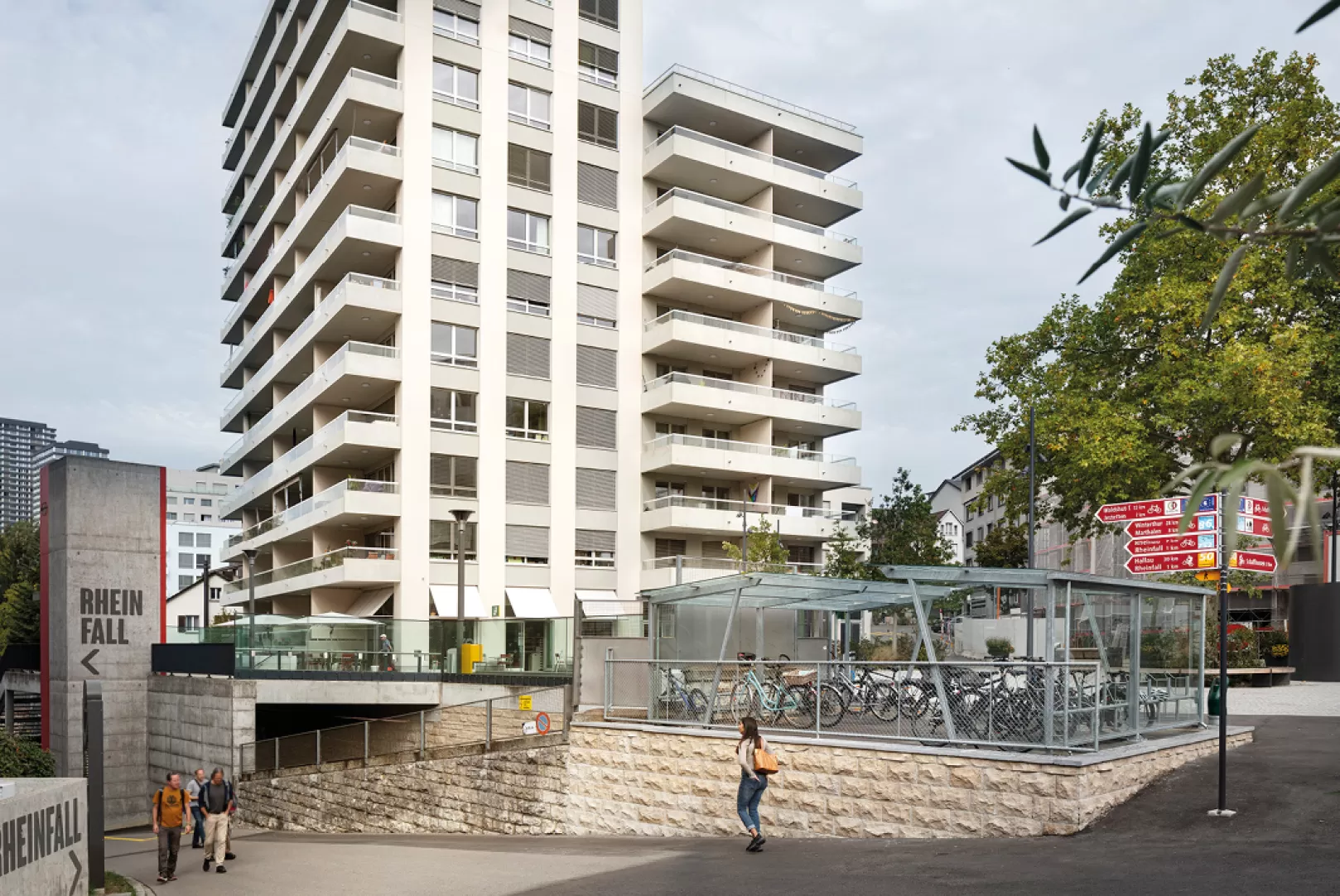 An diesem zentralen Entwicklungsschwerpunkt der Gemeinde ist auf mehreren Grundstücken eine Zentrumsüberbauung mit einer eigenen S-Bahn-Station, Einkaufsmöglichkeiten und dem Rheinfall vor der Tür entstanden. Der aus dem Studienauftrag an sechs Architektenteams als Sieger hervorgegangene Vorschlag überzeugte mit einem abgestuften Baukörper mit publikumsorientierten Flächen im Erdgeschoss und attraktiven Wohnungen in den Obergeschossen.