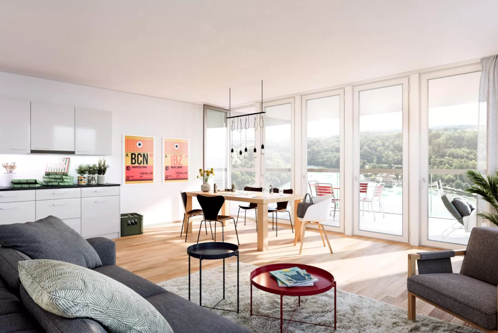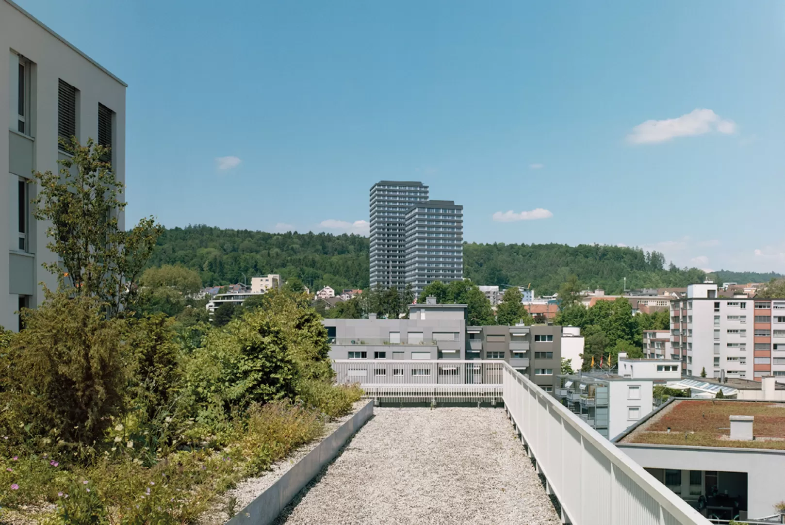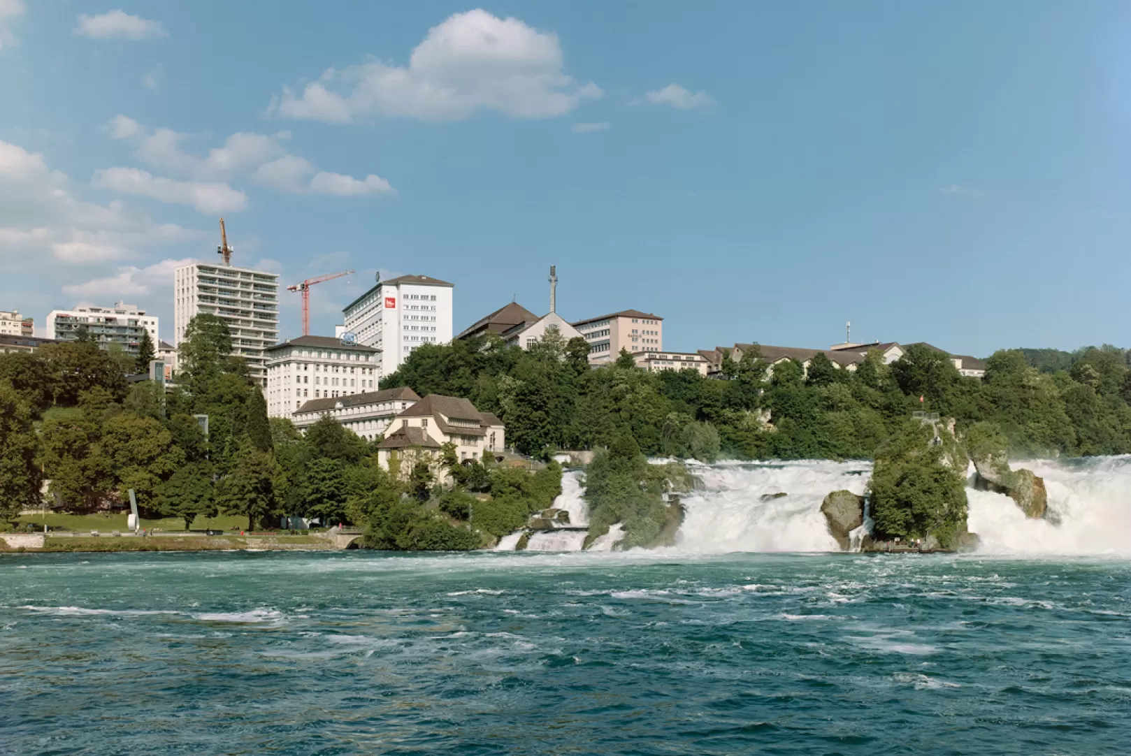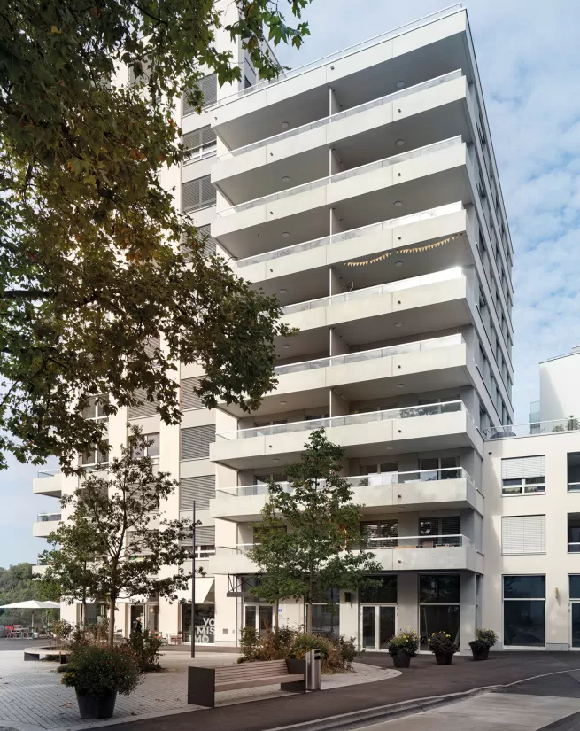 An diesem zentralen Entwicklungsschwerpunkt der Gemeinde ist auf mehreren Grundstücken eine Zentrumsüberbauung mit einer eigenen S-Bahn-Station, Einkaufsmöglichkeiten und dem Rheinfall vor der Tür entstanden. Der aus dem Studienauftrag an sechs Architektenteams als Sieger hervorgegangene Vorschlag überzeugte mit einem abgestuften Baukörper mit publikumsorientierten Flächen im Erdgeschoss und attraktiven Wohnungen in den Obergeschossen.
