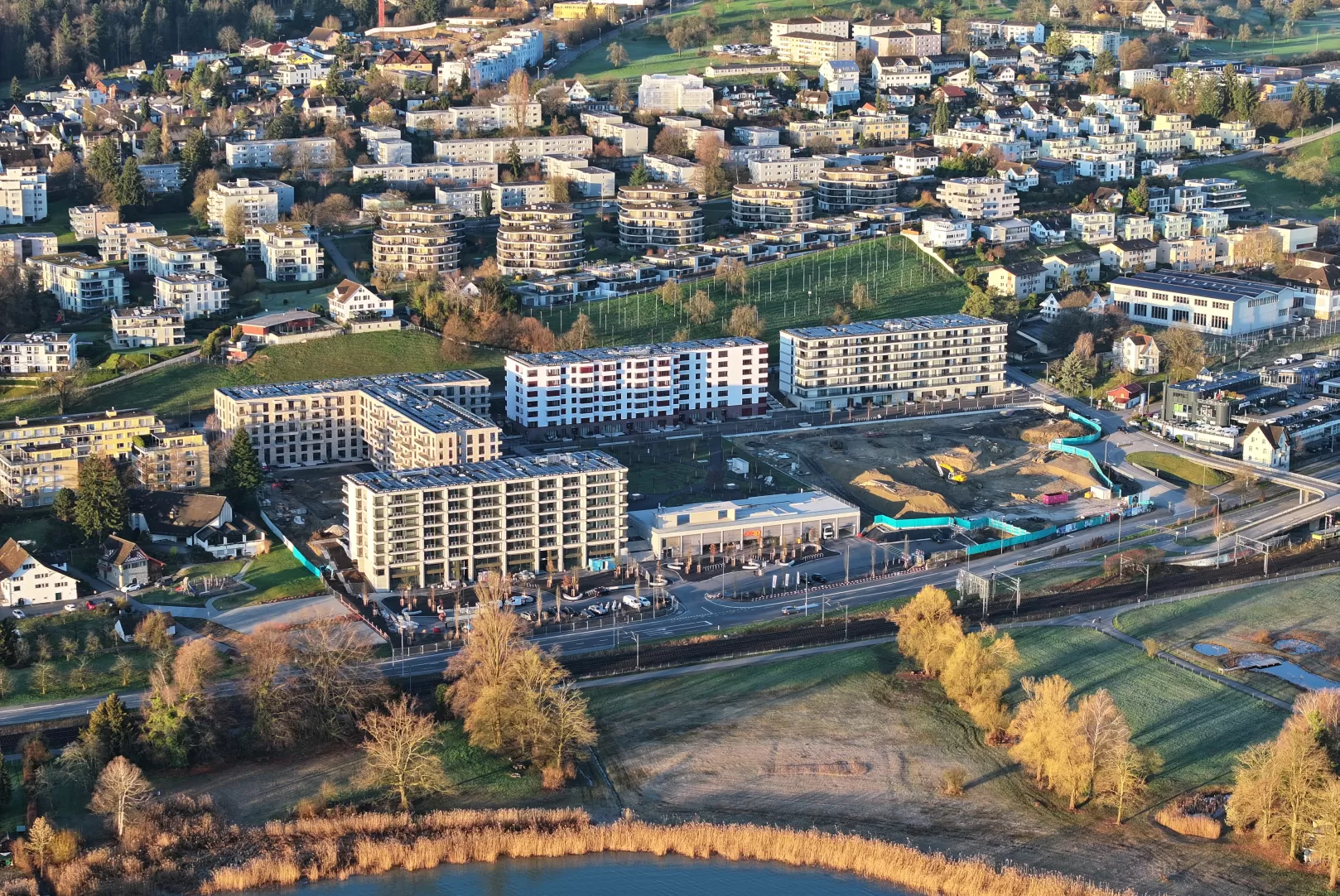 Mit der Überbauung AuPark ist an attraktiver Hanglage in unmittelbarer Nähe zum Zürichsee ein hochwertiges Wohnensemble realisiert worden. Es umfasst fünf Mehrfamilien- und Geschäftshäuser mit insgesamt 300 Wohnungen, darunter 111 Stockwerkeigentumseinheiten. Im Herzen der Überbauung befindet sich der namensgebende AuPark – eine grosszügige Grünanlage, die als zentraler Treffpunkt und Erholungsraum für die Bewohnerschaft dient. Weitläufige Rasenflächen und der freie Blick auf den Zürichsee schaffen eine besondere Aufenthaltsqualität.