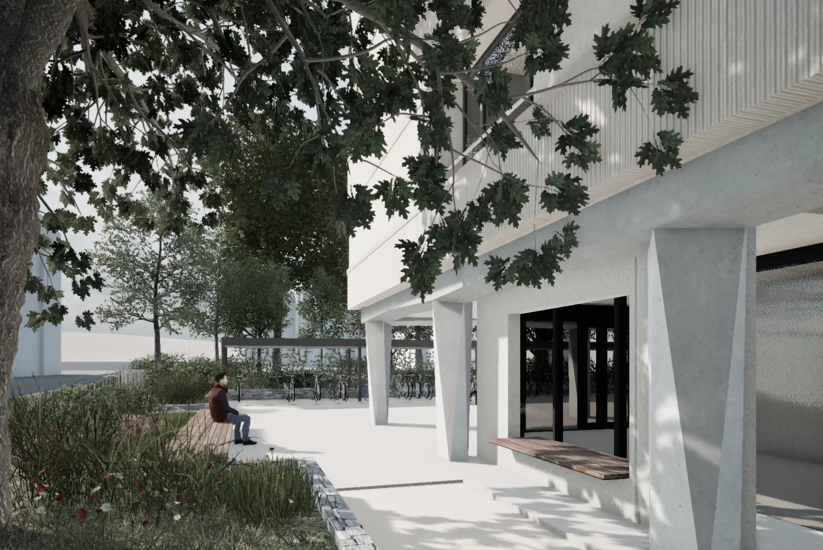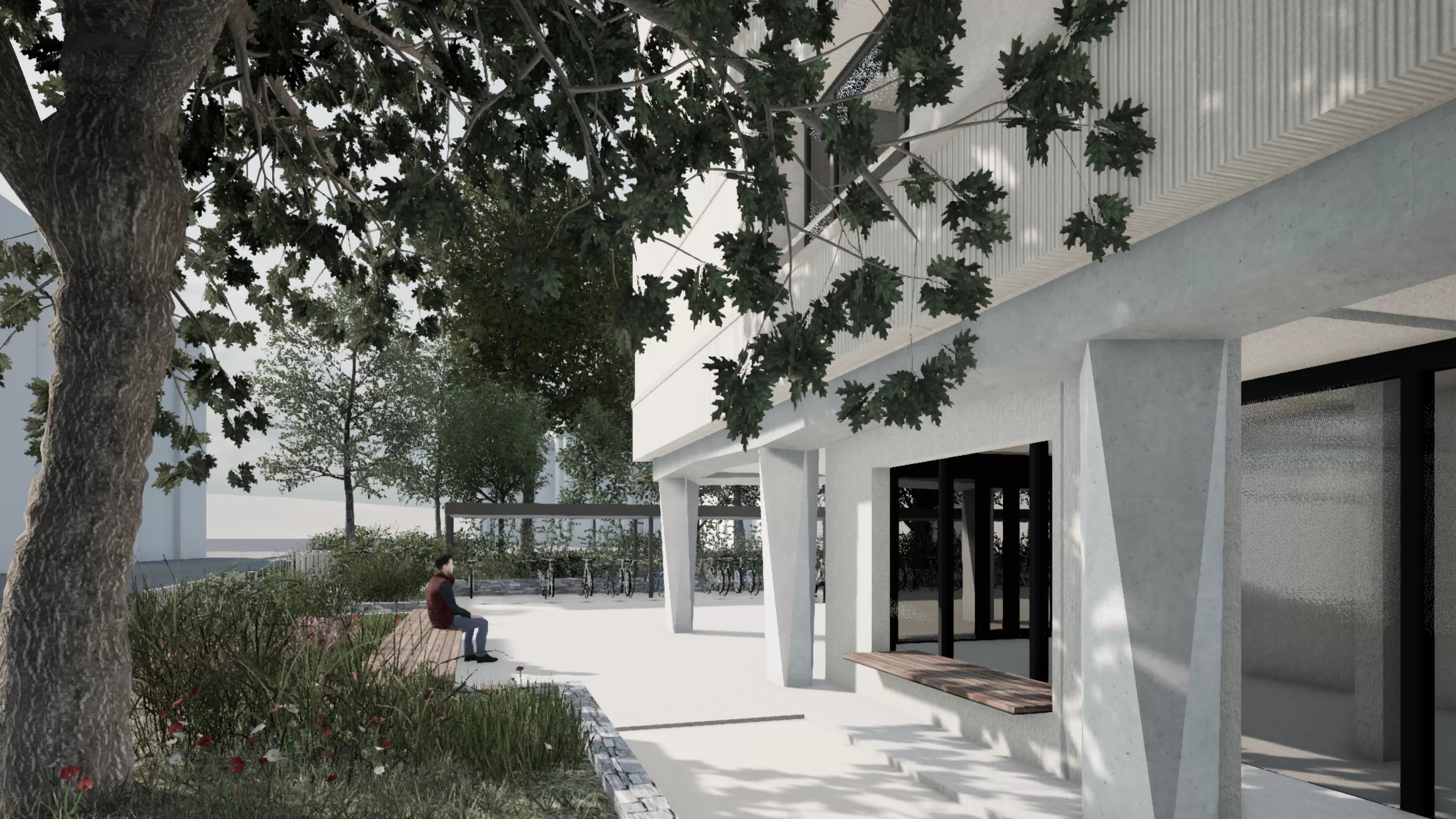 Das Erdgeschoss wird neu organisiert und schafft zusätzliche Flächen für die Bewohnenden sowie quartierbezogene Nutzungen. Die Aussenräume werden im Rahmen eines Landschaftsprojekts aufgewertet, bewaldete Flächen werden integriert. Dies fördert sowohl die Lebensqualität als auch die Biodiversität.
