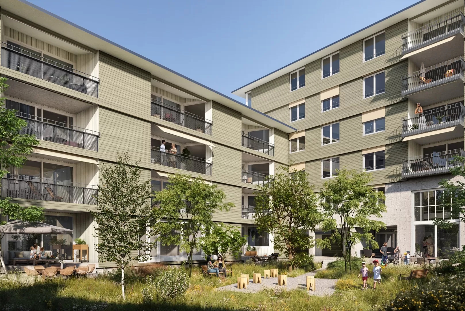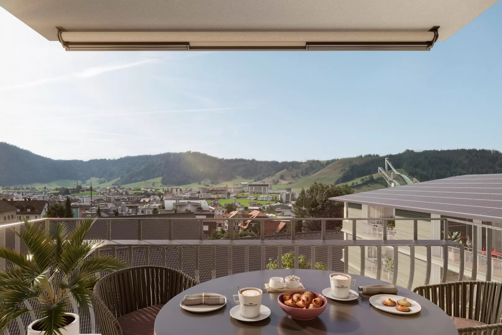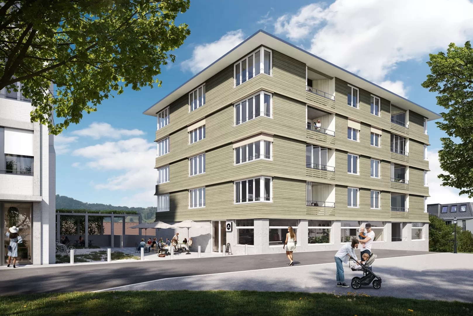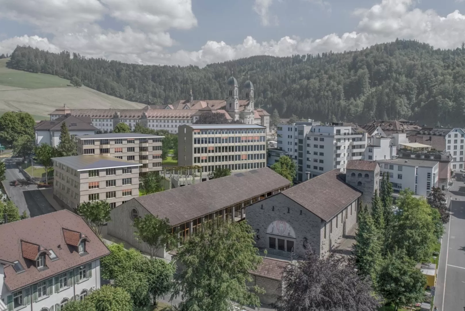 Angrenzend an den Klosterplatz, an äusserst zentraler Lage, werden in einer gemischten Überbauung ein neues Pfarreizentrum, die Bezirksverwaltung und Eigentumswohnungen realisiert. Die Konstruktionen der einzelnen Gebäude werden in Hybridbauweise realisiert, welche sich durch Holzaussenwände mit hinterlüfteten Holzschalungen und Dächern in traditioneller Zimmermannsarbeit auszeichnen. Durch die Symbiose moderner Bauweisen mit handwerklicher Tradition wird nicht nur zeitlose Ästhetik, sondern auch die ressourcenschonende und nachhaltige Verpflichtung unterstrichen.