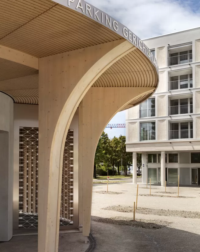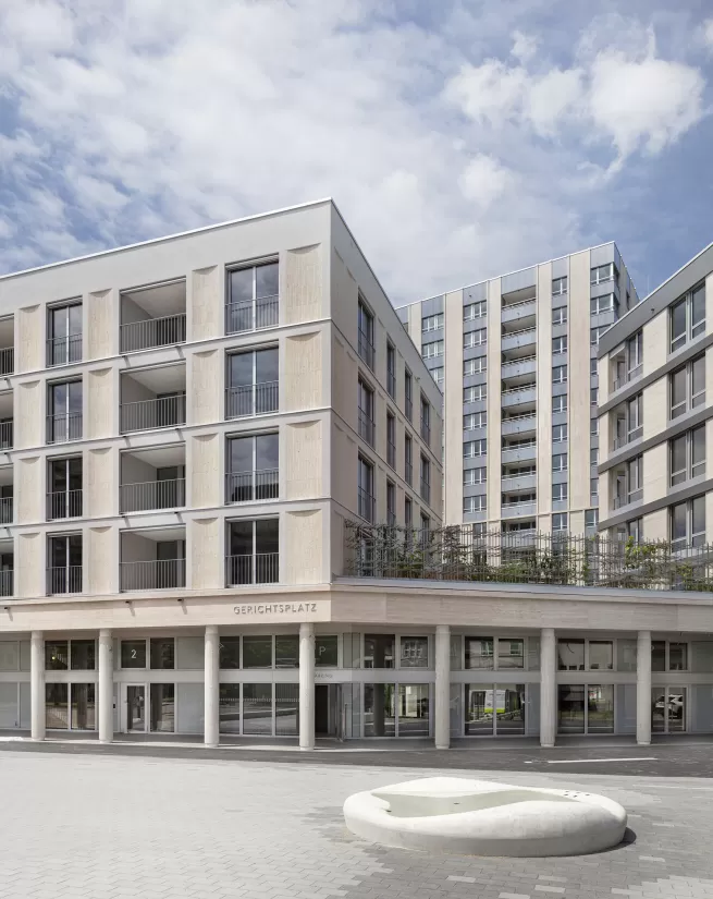 Die Überbauung bildet ein neues Zentrum im Rücken des Bahnhofes und stellt gleichzeitig eine Verdichtung des Stadtzentrums von Uster dar. In der ersten Etappe werden die 3 Häuser mit unterschiedlichen Volumen und Höhen gebaut, die durch einen Sockel verbunden sind. Das Sockelgeschoss beherbergt Dienstleistungsflächen, ein Café und ist die Zugangsebene zu den Mietwohnungen. Der begrünte gemeinschaftliche Dachgarten soll als ökologische Oase fungieren. Das Untergeschoss enthält die Einstellplätze, Technikräume, Keller und die Räumlichkeit des Contractors und der Trafostation. Die Ausgestaltung des Gerichtsplatzes sieht einen Brunnen, üppige Bepflanzung und Freiflächen vor.