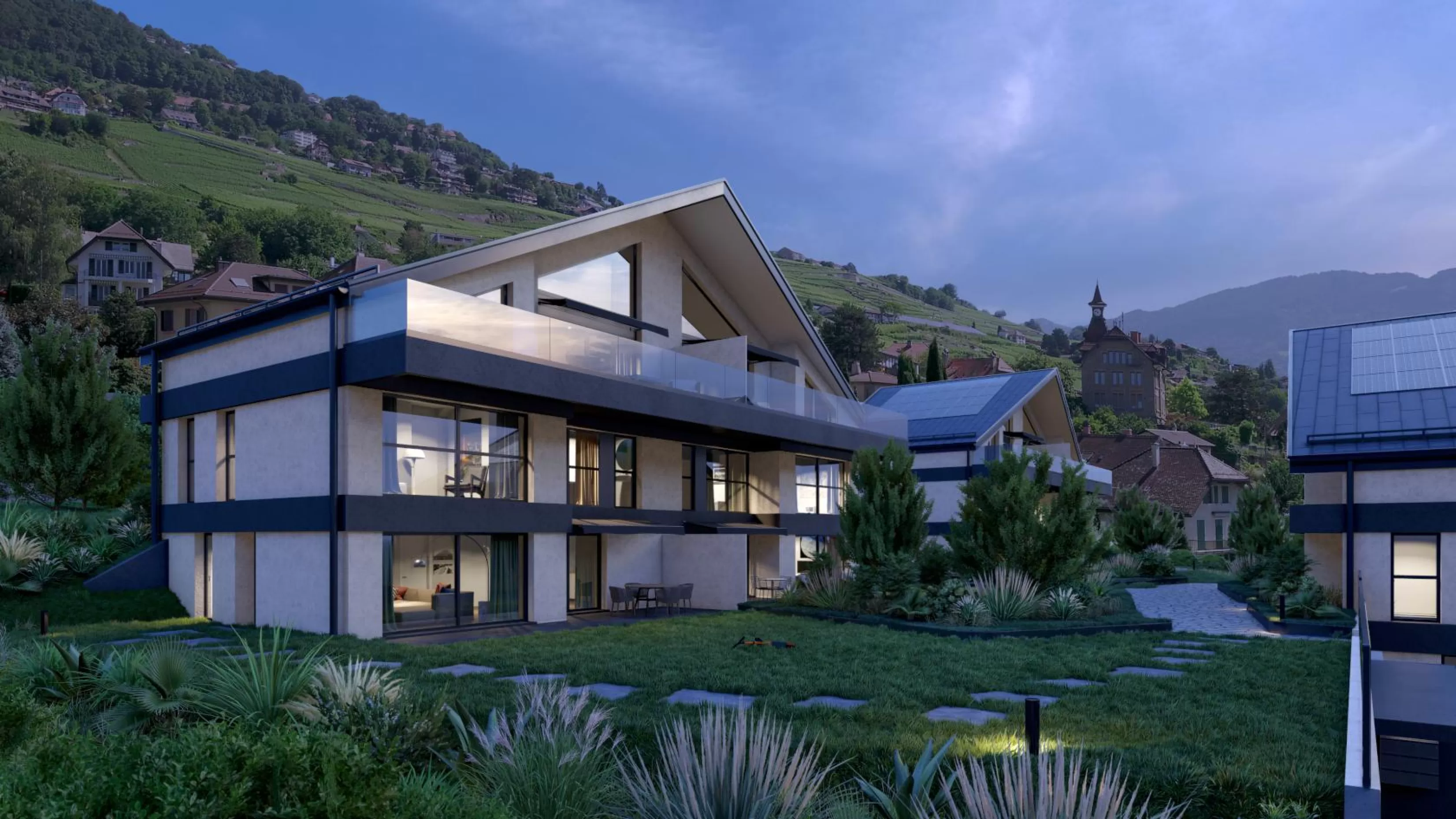 Im Herzen des Lavaux, das zum UNESCO-Weltkulturerbe gehört, im Winzerdorf Corseaux, geniesst die Residenz Les Cerisiers eine herausragende Lage zwischen Reben und See. Das Projekt umfasst drei zeitgenössische Villen mit insgesamt zwölf Duplex-Wohnungen, die dank nach Süden ausgerichteter Fensterfronten eine helle und offene Wohnatmosphäre bieten. Jede Wohnung verfügt über grosszügige Terrassen und begrünte Gärten und bietet Komfort, Privatsphäre sowie einen unvergleichlichen Blick auf den Genfersee und die Alpen.