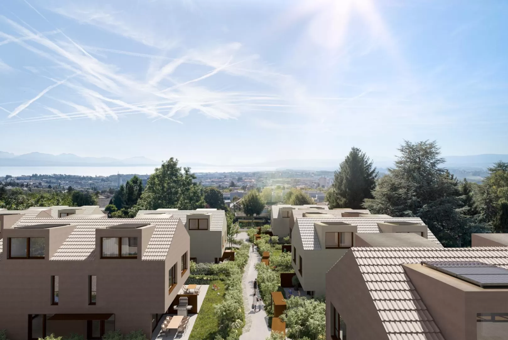 In Renens gelegen, vereint das Projekt Osmose 30 zeitgenössische Villen, die für ein Leben in Harmonie mit der Natur konzipiert sind. Die Häuser sind so gestaltet, dass sie das Tageslicht von morgens bis abends einfangen und grosszügige, helle Wohnräume bieten, die sich zu weitläufigen privaten Gärten öffnen. Jede Villa ist mit Solarmodulen ausgestattet, die den Eigenverbrauch unterstützen und den Minergie-Standards entsprechen. Zwischen ruhigem Wohnambiente und der Nähe zum dynamischen Zentrum von Renens verkörpert Osmose eine ausgewogene Verbindung von Gelassenheit, Modernität und Nachhaltigkeit. Dieses grüne Quartier, das sanfte Mobilität fördert, schafft einen Lebensraum, der auf Wohlbefinden und Zukunft ausgerichtet ist.