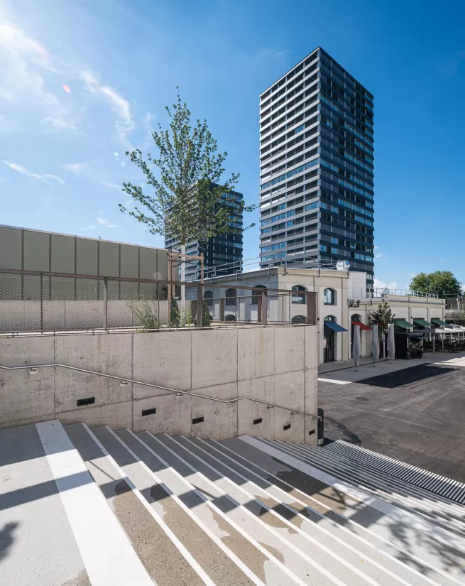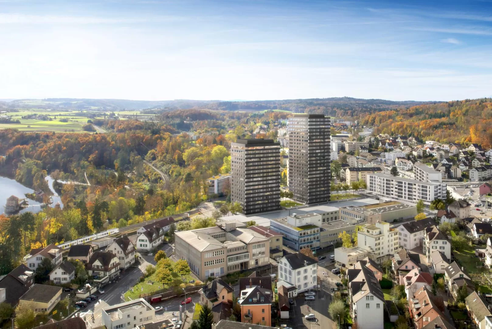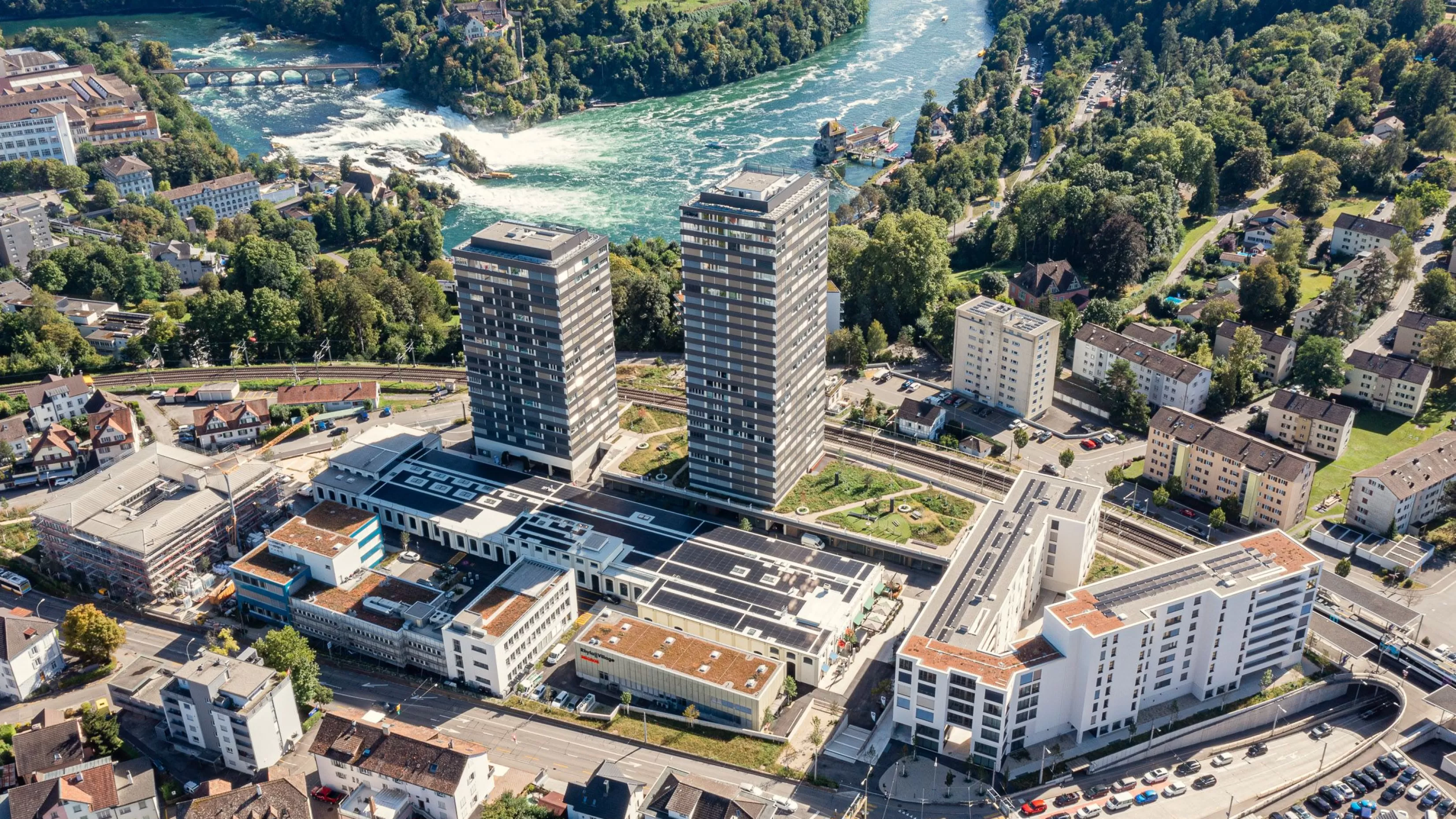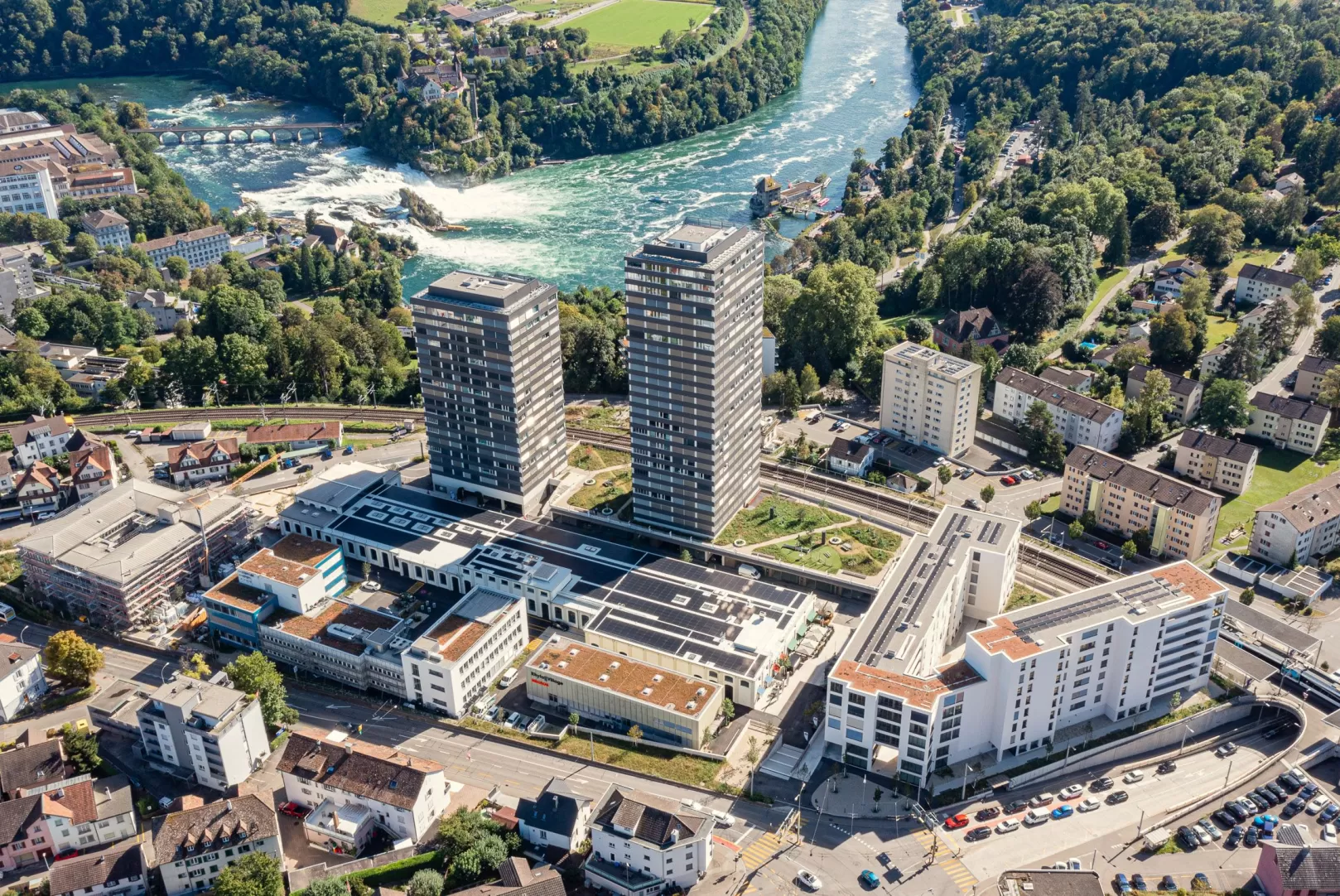 Das ehemalige Industrieareal am Badischen Bahnhof präsentiert sich neu als lebendiges und offenes Quartier mit Wohnungen, Verkaufs- und Gewerbeflächen sowie Freizeit- und Gastronomieangeboten. In Form von Plätzen, Promenaden und Parks sind auch neue Begegnungszonen entstanden. Der Städtebau knüpft geschickt an die Geschichte an und kombiniert Neubauten mit der bestehenden, alten «Halle 22». Herausragende Merkmale des Quartiers bilden dabei zwei äusserlich identisch wirkende Hochhäuser, die sich nur in ihrer Höhe von 60 und 80 Metern unterscheiden. Im westlichen Gebäude sind 116 Mietwohnungen und ein Rooftop-Restaurant entstanden, im östlichen 96 Eigentumswohnungen. Alle grösseren Wohnungen verfügen über unbeheizte, mit Schiebefenstern verschlossene Logien, die einem windgeschützten Aussenraum gleichkommen – meist mit Blick auf den Rheinfall.