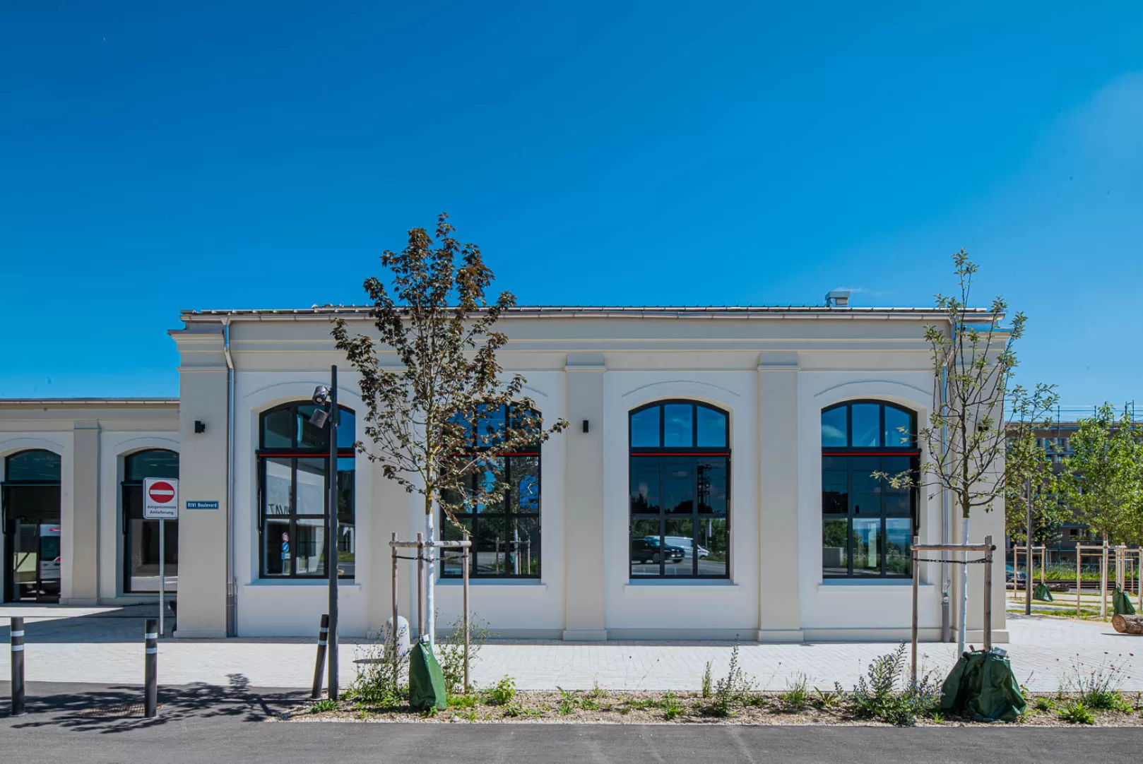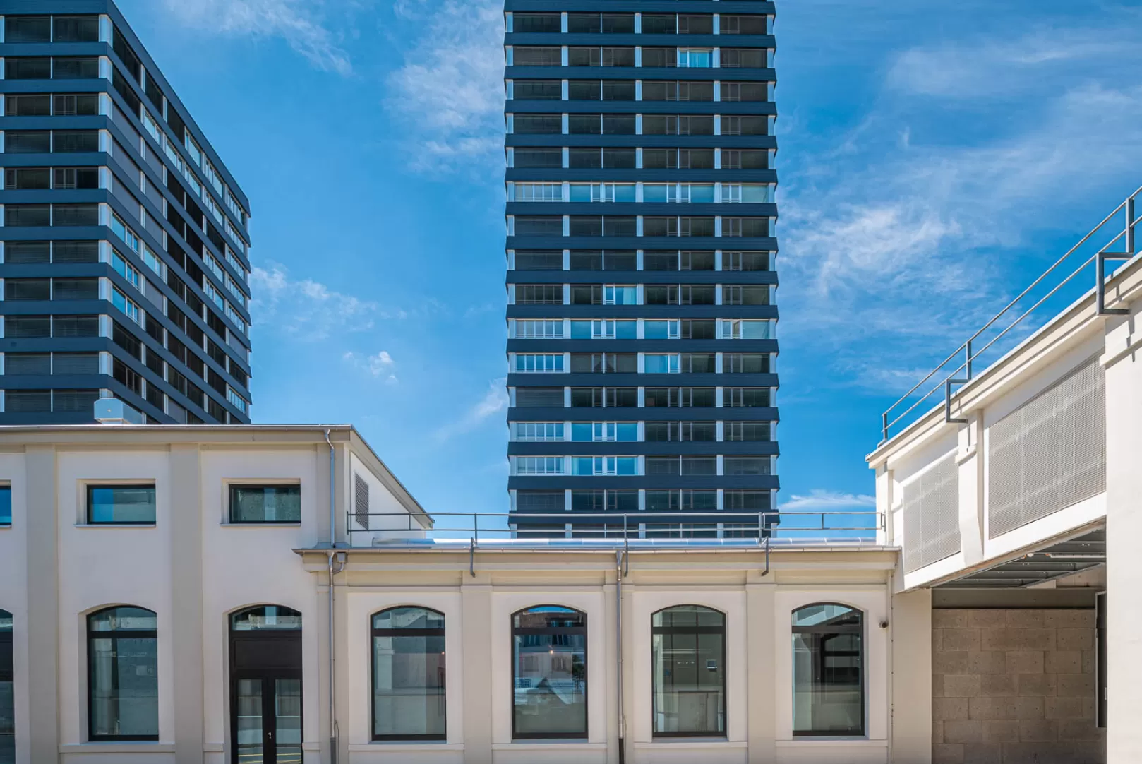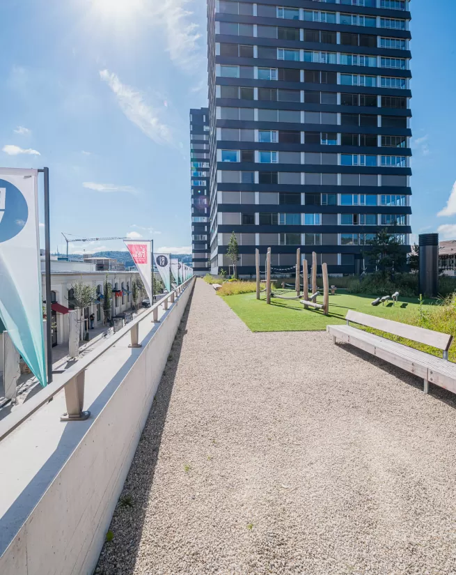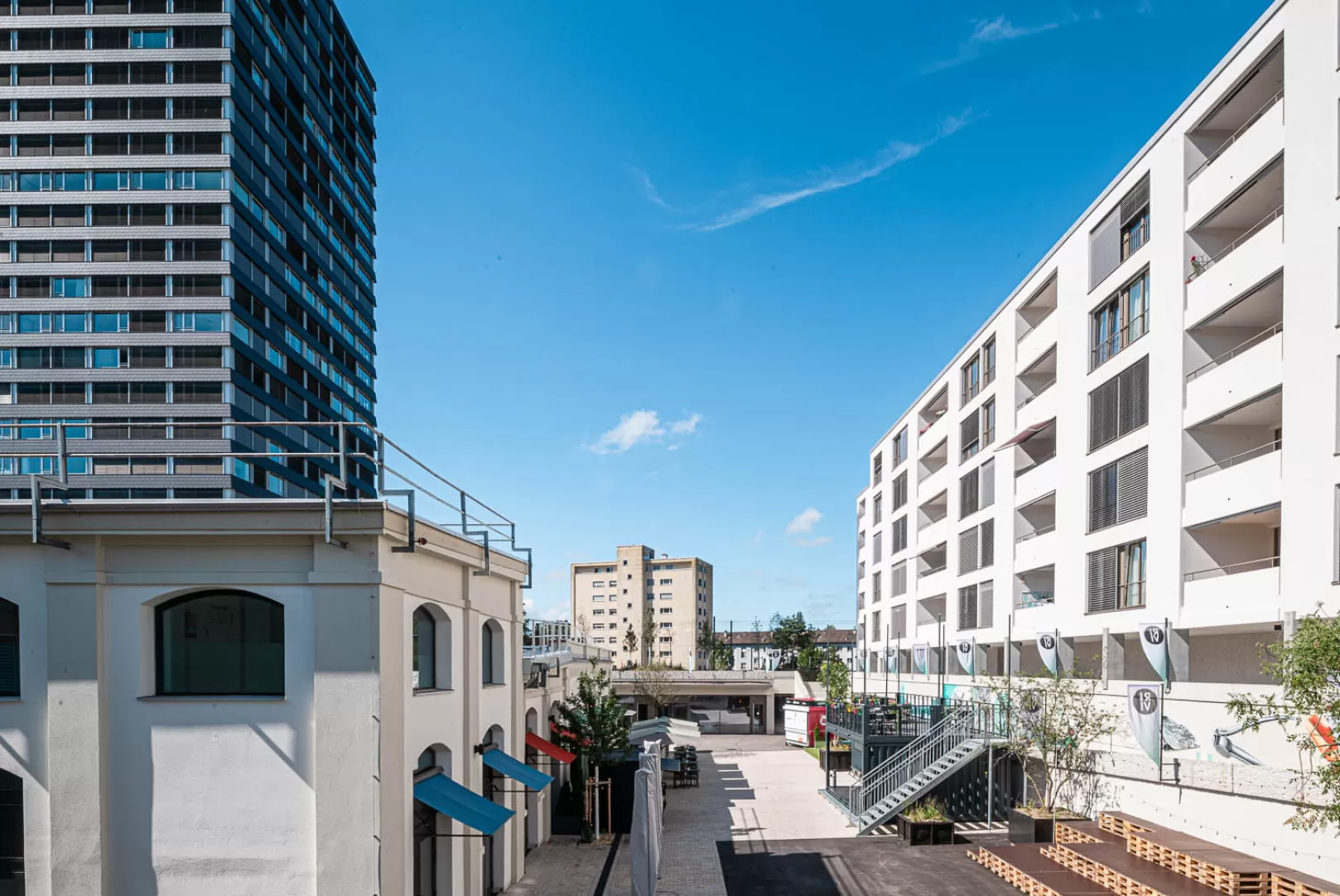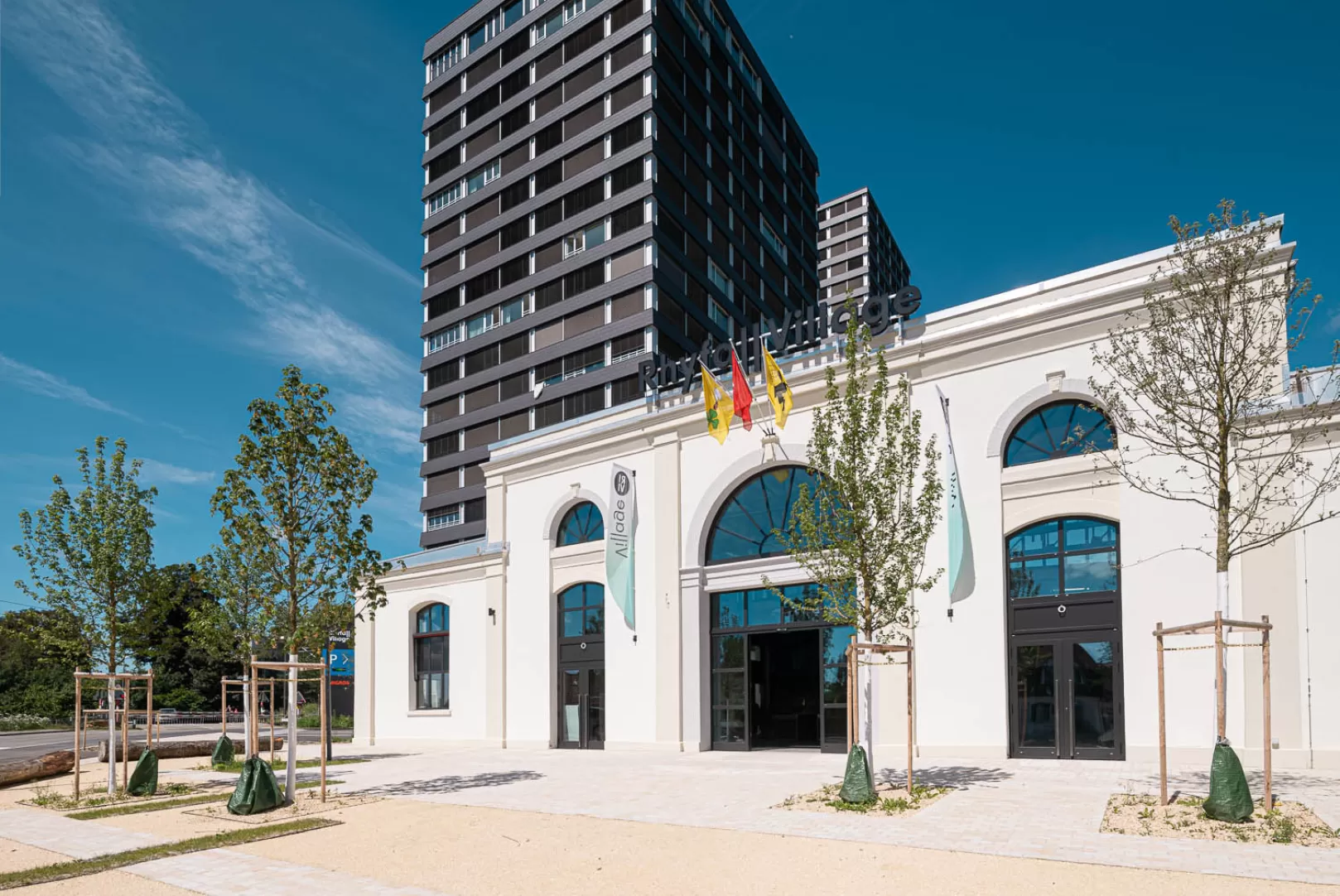 Das ehemalige Industrieareal am Badischen Bahnhof präsentiert sich neu als lebendiges und offenes Quartier mit Wohnungen, Verkaufs- und Gewerbeflächen sowie Freizeit- und Gastronomieangeboten. In Form von Plätzen, Promenaden und Parks sind auch neue Begegnungszonen entstanden. Der Städtebau knüpft geschickt an die Geschichte an und kombiniert Neubauten mit der bestehenden, alten «Halle 22». Herausragende Merkmale des Quartiers bilden dabei zwei äusserlich identisch wirkende Hochhäuser, die sich nur in ihrer Höhe von 60 und 80 Metern unterscheiden. Im westlichen Gebäude sind 116 Mietwohnungen und ein Rooftop-Restaurant entstanden, im östlichen 96 Eigentumswohnungen. Alle grösseren Wohnungen verfügen über unbeheizte, mit Schiebefenstern verschlossene Logien, die einem windgeschützten Aussenraum gleichkommen – meist mit Blick auf den Rheinfall.