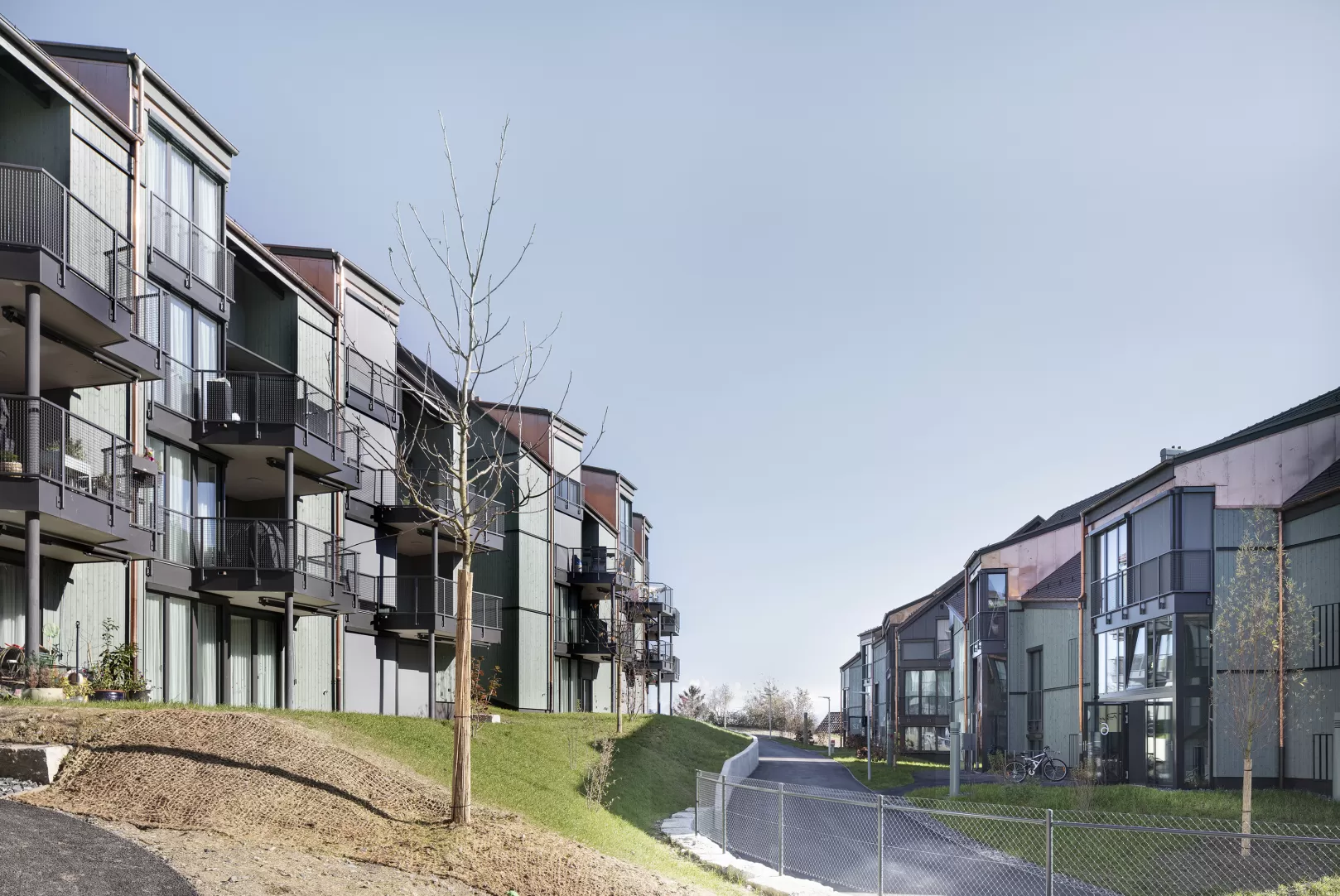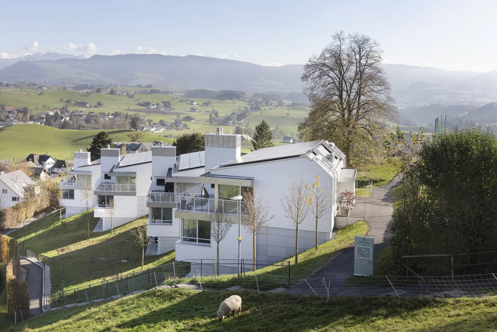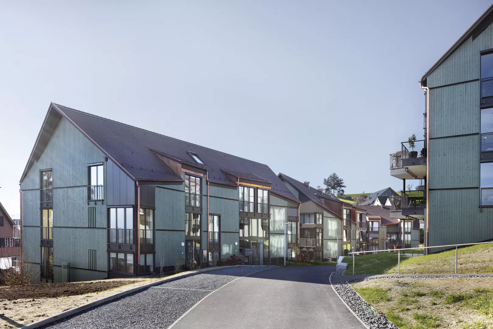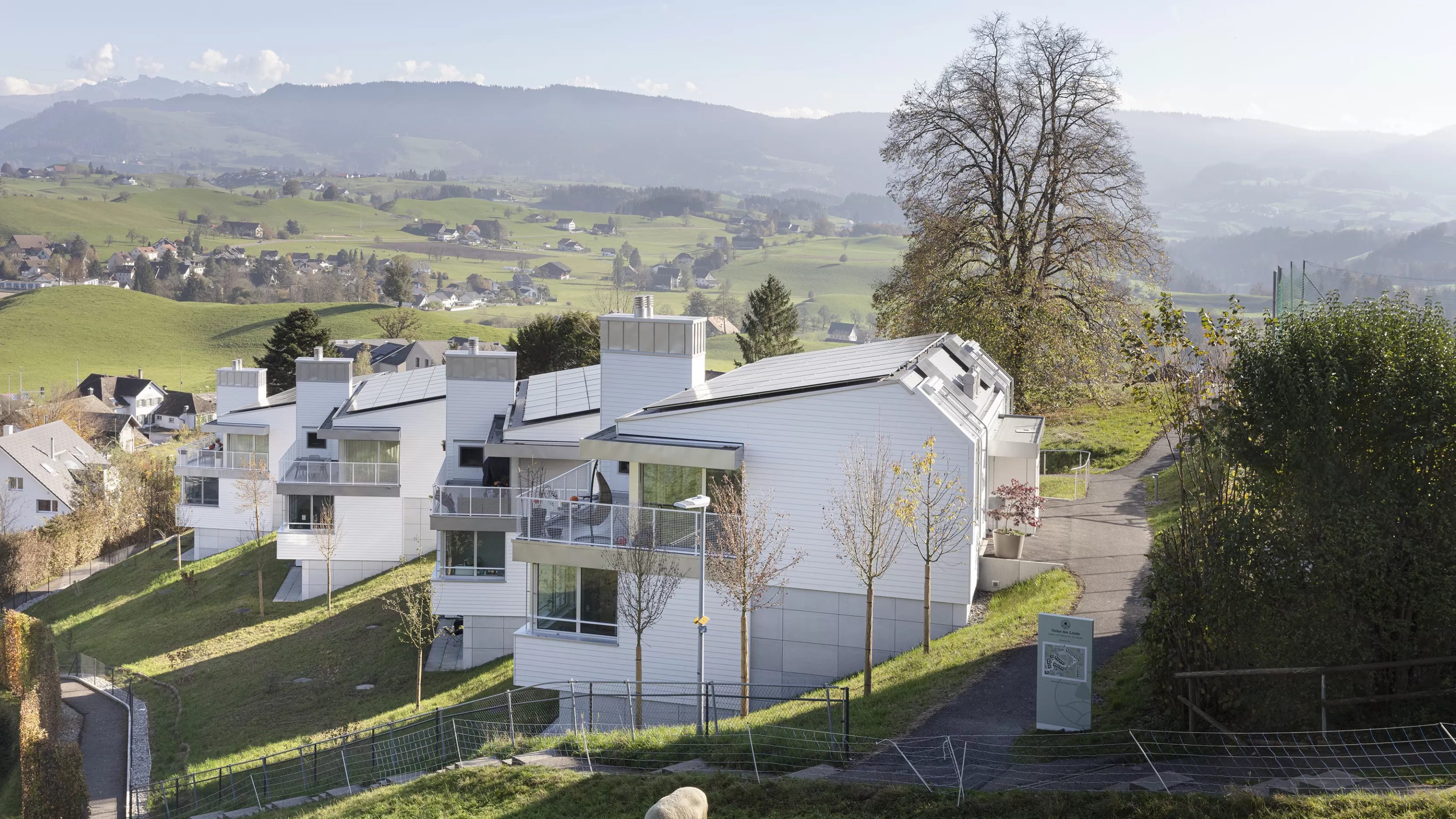 Im Zentrum von Hirzel entstand ein ortsbaulich überzeugendes Projekt, das sich optimal in den historischen Dorfkern und die Landschaft unterhalb des Schulareals einfügt. Das Wohnungsangebot richtet sich in erster Linie an Familien, die sowohl die Idylle im Dorf als auch die Nähe zu Zürich und Zug schätzen. Die Wohnungen profitieren zudem von der attraktiven Fernsicht, der Lage über der Nebelgrenze sowie den grosszügigen, naturnah gestalteten Aussenräumen. Die visuelle Gestaltung der Gebäude wird durch traditionell gefertigte Steildächer und hinterlüftete Holzfassaden charakterisiert, die sich harmonisch in die Umgebung einfügen.