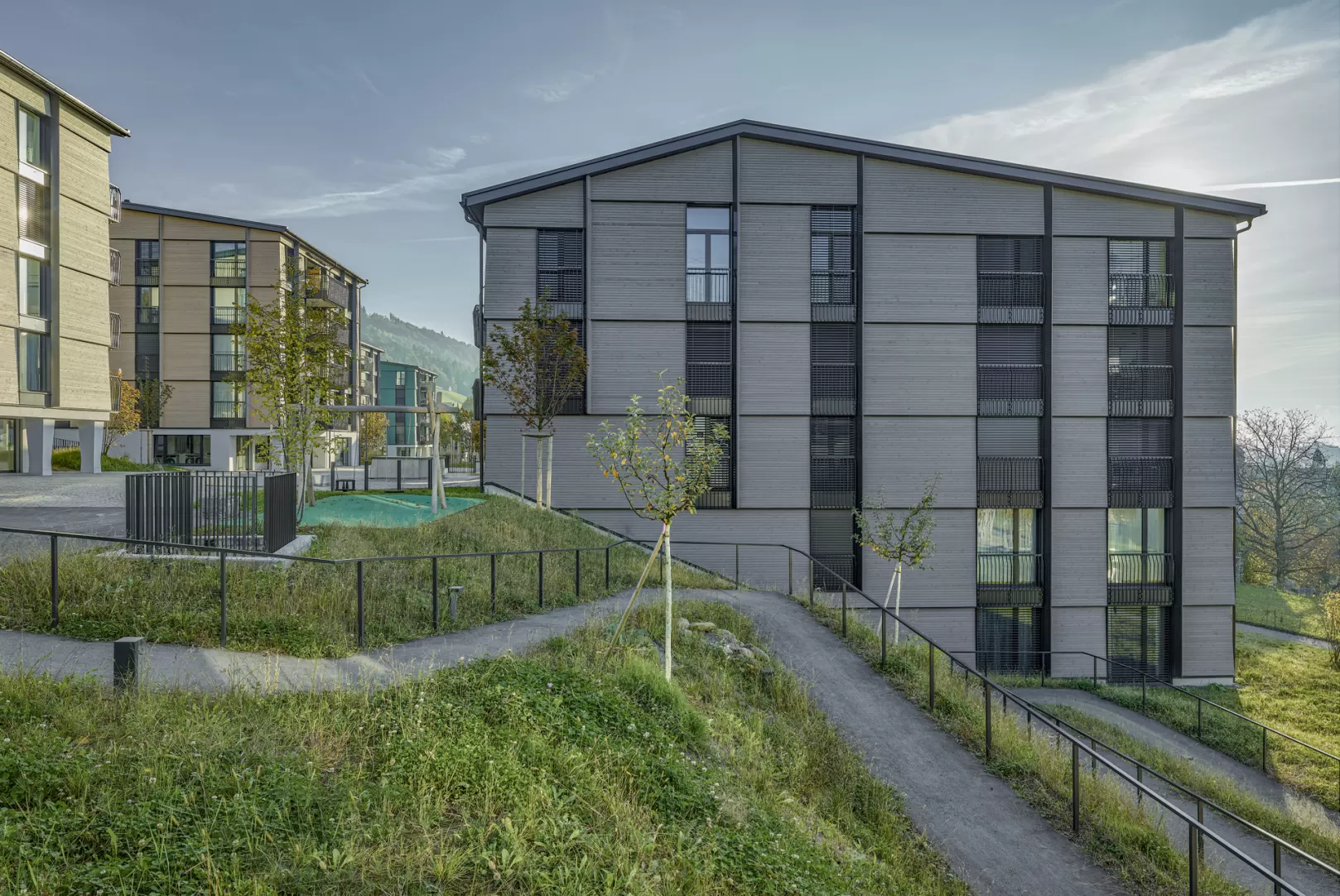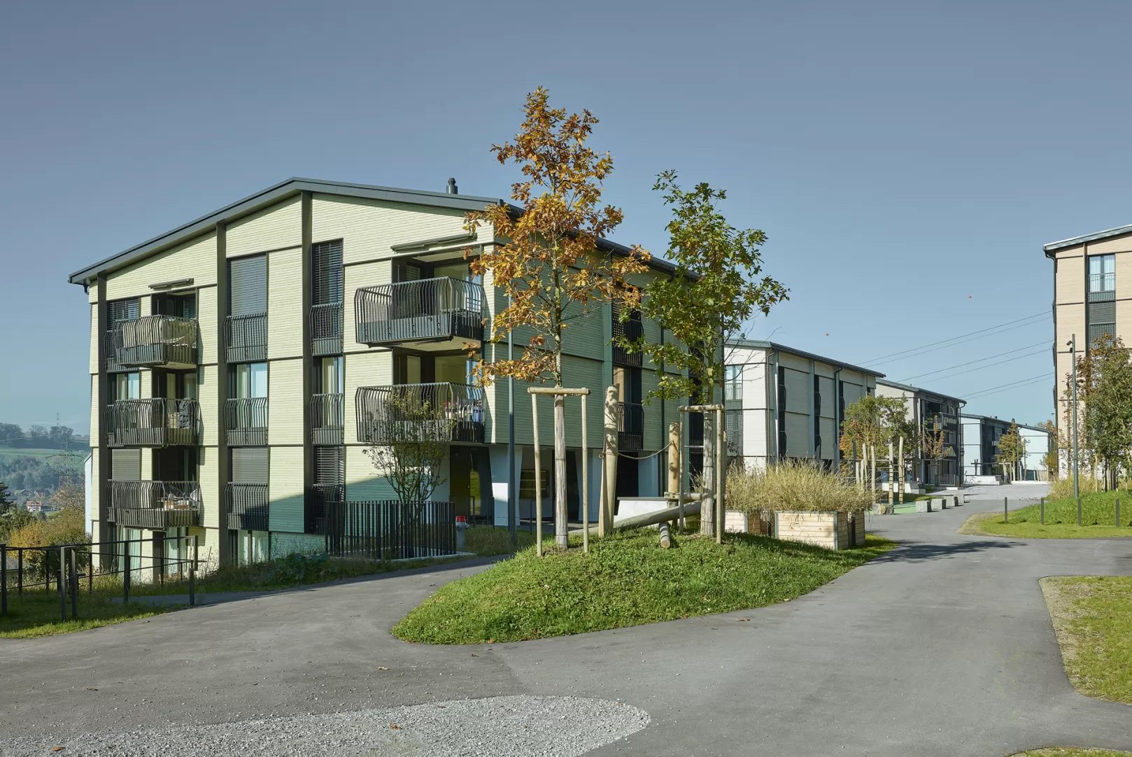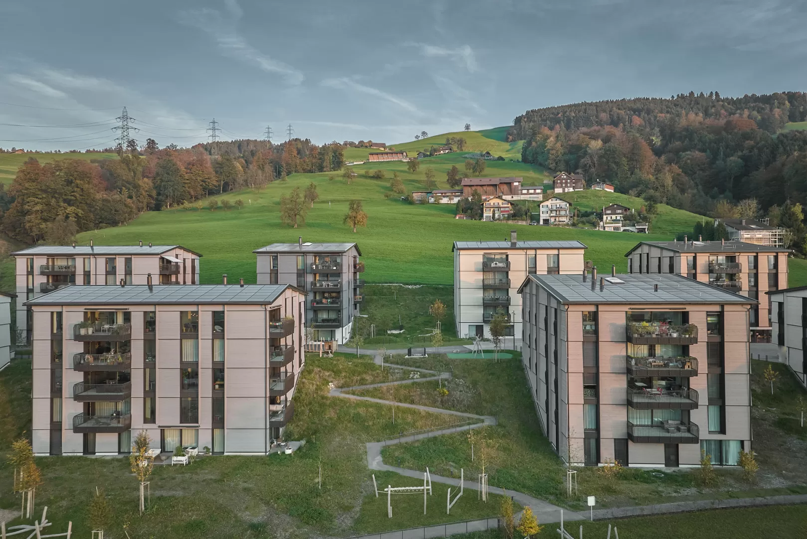 An einem sonnigen Westhang über dem Rontal wurde zusammen mit der Stiftung Abendrot eine Wohnüberbauung, in der dem teilgemeinschaftlichen Wohnen grosse Bedeutung geschenkt wird, realisiert. Das äussere Erscheinungsbild der Gebäude wurde durch traditionelle Steildächer und hinterlüftete Fassaden aus Holz geprägt. Die Verwendung natürlicher Baumaterialien ermöglichte eine authentische Integration der Strukturen in die organische Umgebung.