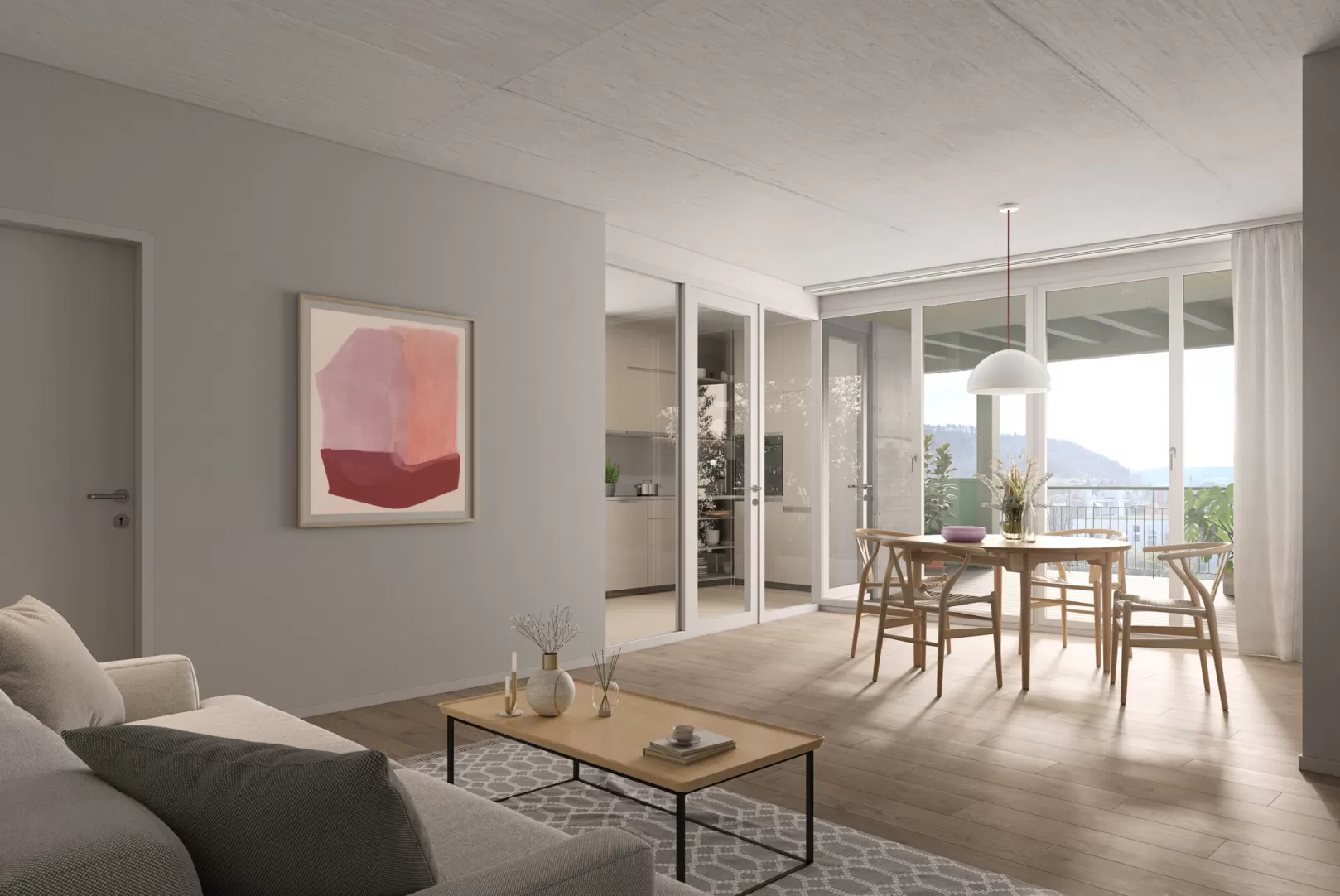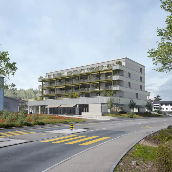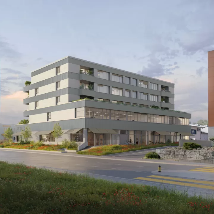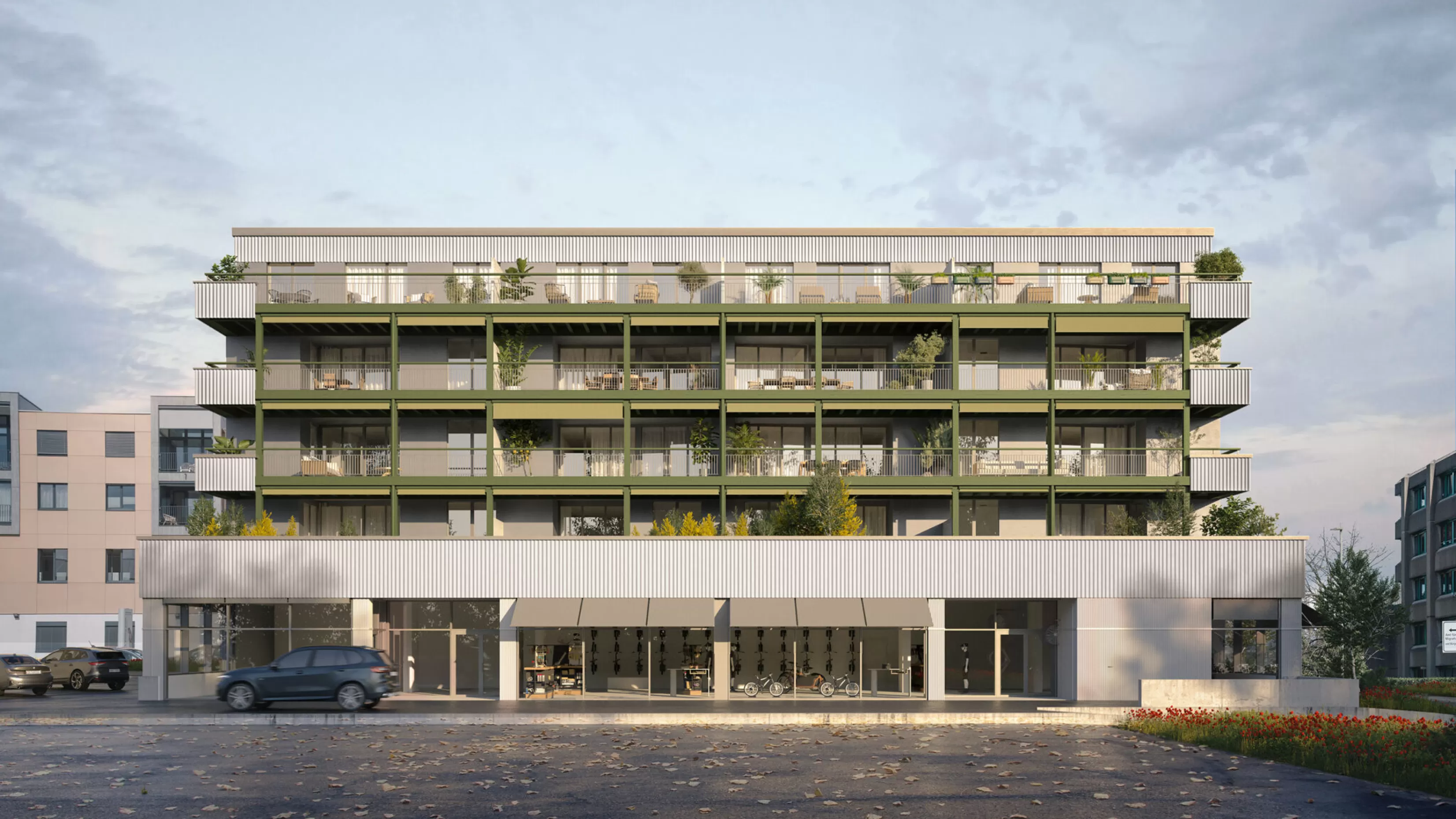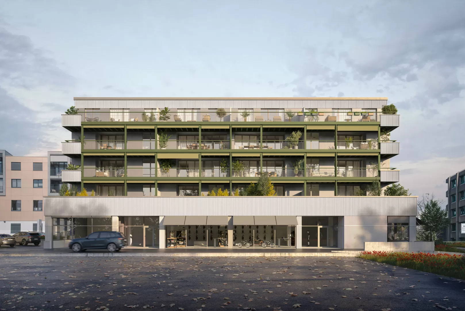 In unmittelbarer Nähe zum Bahnhof Frenkendorf entsteht ein Wohn- und Geschäftshaus mit Mischnutzung aus Wohnen, Arbeiten und Gewerbe. Das Areal ist heute mehrheitlich gewerblich genutzt, gewinnt jedoch im Zuge städtebaulicher Entwicklungen zunehmend an Standortqualität und urbaner Ausstrahlung. Der fünfgeschossige Baukörper mit Attika vereint verschiedene Nutzungen: Im Erdgeschoss entstehen flexibel teilbare Gewerbeflächen, im ersten Obergeschoss moderne Büroeinheiten. In den oberen Etagen sind 22 Wohnungen mit 2.5- und 3.5-Zimmer-Grundrissen vorgesehen. Die klar gegliederte Architektur mit markanten Fenster- und Brüstungsbändern verleiht dem Gebäude einen eigenständigen, zeitgemässen Ausdruck. Grosszügige Verglasungen öffnen die Längsseiten, während geschlossene Stirnseiten den Lärmschutz sicherstellen. Mit seiner durchdachten Nutzungsmischung und der optimalen Anbindung trägt das Projekt zur nachhaltigen Aufwertung der aufstrebenden Region bei.