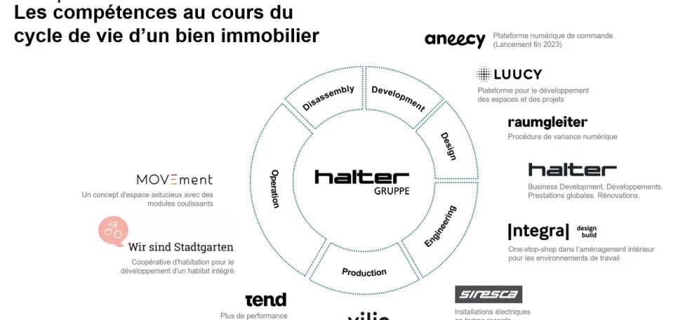 Les entreprises du groupe Halter sont unies par une vision commune : soutenir l'objectif de durabilité zéro net dans tous les projets en établissant l'économie circulaire. Dans ce cadre, des services et des produits sont spécifiquement conçus et développés au sein de chacune des sociétés sœurs, tout au long du cycle de vie des biens immobiliers. Grâce à une culture unifiée, les synergies en termes de processus et de technologies peuvent être utilisées pour promouvoir l'innovation. Les entreprises du groupe Halter continuent d'opérer de manière indépendante et autonome, avec des modèles d'entreprise dédiés et complémentaires et une approche «best in class».
